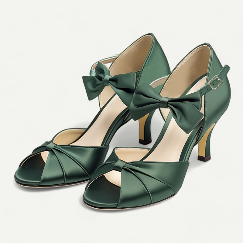 Green Satin Open-Toe High Heel Sandals with Bow Detail for Women - Elegant Wedding or Evening Shoes