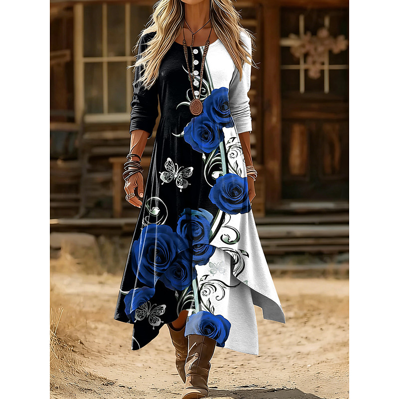 Women's Midi Dress Shift Dress Casual Daily Holiday Regular Fit Floral Graphic Long Sleeve Crew Neck Blue Red Purple Green Spring Winter