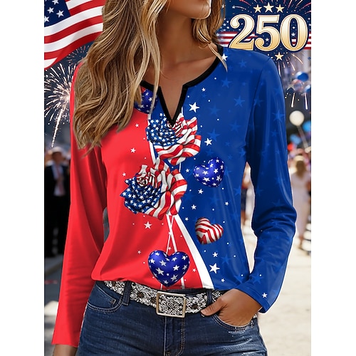 Giorno dell'Indipendenza Americana Per donna Maglietta Grafico Bandiera Americana Vintage Elegante Moderno Manica Lunga Collo a V Top Regolari Quotidiano Weekend Stampato Blu Nero Rosso Estate