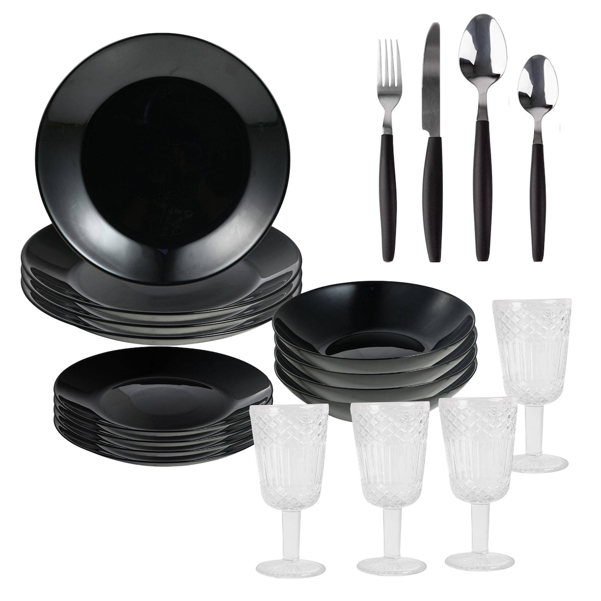 San Ignacio - 12-teiliges schwarzes Geschirrset mit 4 transparenten Gläsern 300 ml und 16-teiligem Besteckset aus Edelstahl Schwarz
