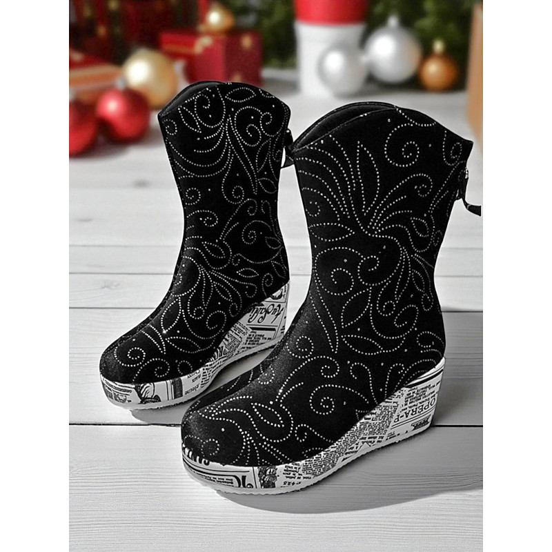 Women's Red Velvet Wedge Ankle Boots with Glitter Rhinestone Design and Printed Sole, Fashion Winter Party Shoes for Christmas Night Out