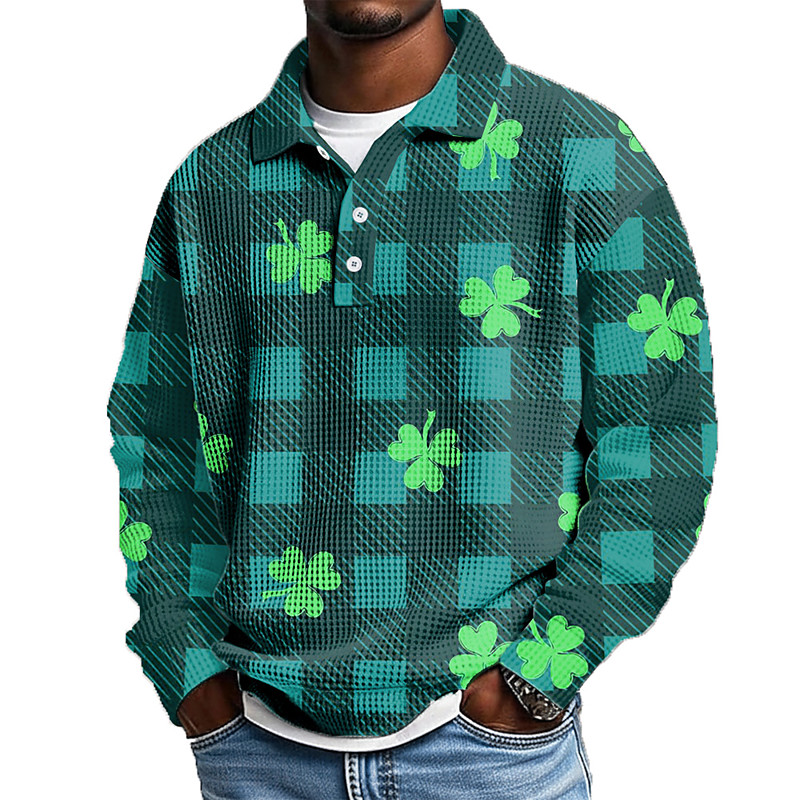 St. Patrick Men's Shamrock Waffle Polo Shirts Long Sleeve Polo Shirts Lapel Casual Athleisure Daily Wear Festival Outfit 3D Print Spring Fall Dark Green Green
