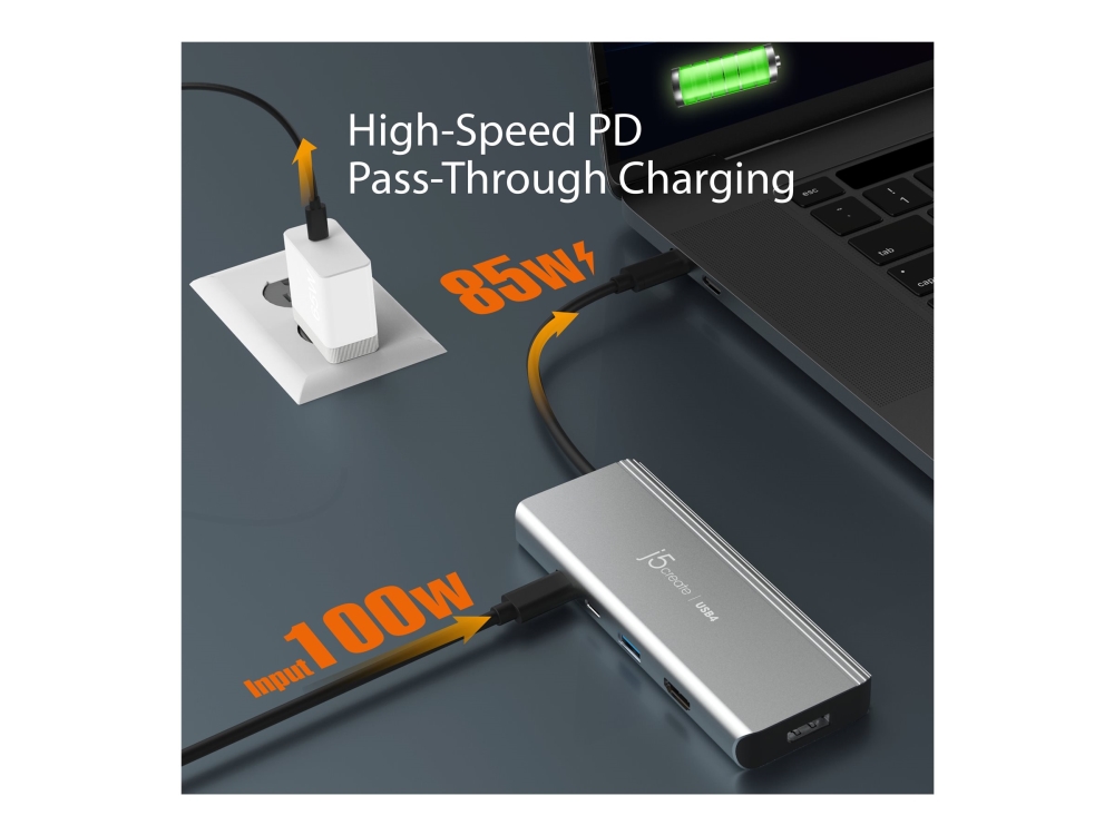 j5create JCD401-N USB4™ Dual 4K Multi-Port Hub, Langallinen, USB 3.2 Gen 2 (3.1 Gen 2) Type-C, 85 W, Hopea, 10 Gbit/s, 4K Ultra HD