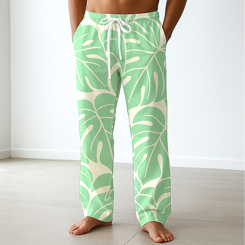 Men's Palm Leaf Tropical Plants Trousers Baggy Pants Casual Pants Mid Waist Hawaiian Vacation Holiday Beach Wear Drawstring Elastic Waist Wide Leg Summer Spring 3D Print Blue Green Gray
