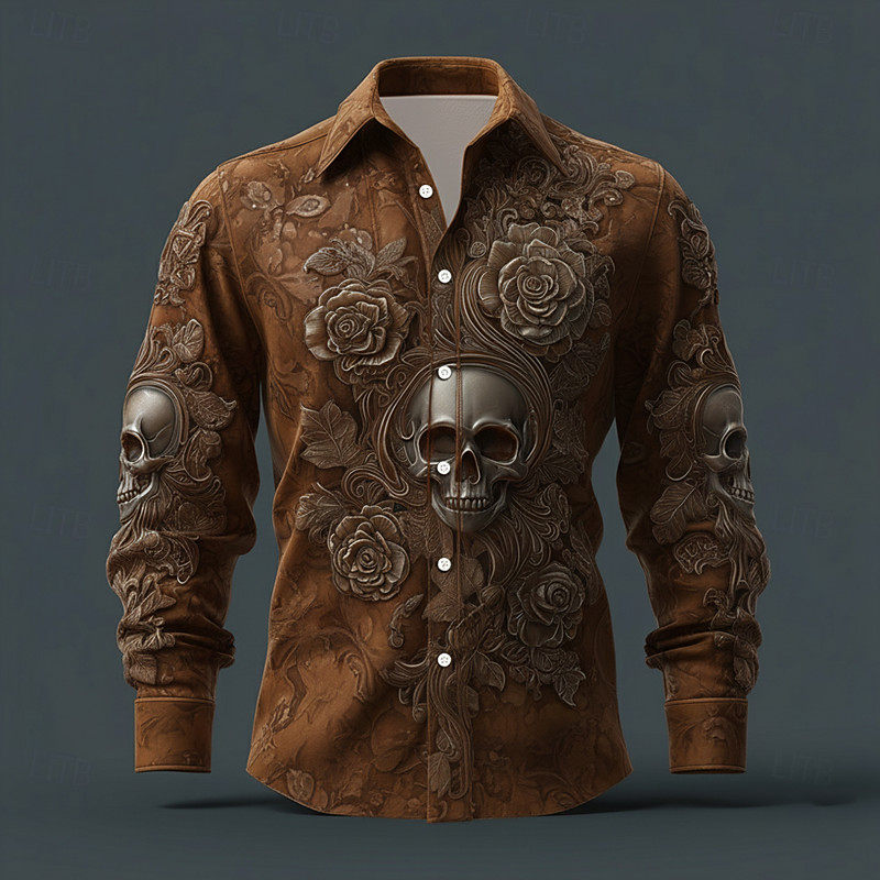 Men's Skull Floral Print Day of the Dead Shirt Button Up Shirt Long Sleeve Vintage Retro Dark Gothic Style Outdoor Holiday Spring Fall Turndown 3D Print Collared Shirts Black Red Blue Orange Brown
