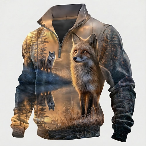 Per uomo Volpe Lupo Stampa 3D Felpa Pantaloni Tattici Vintage Retrò Da caccia Collo alla coreana All'aperto Lavoro Regalo Marrone Cerniera Autunno Inverno progettista S M L XL XXL XXXL