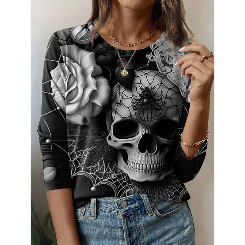 Women's T Shirt Skulls Graphic Vintage Fashion Stylish Long Sleeve Crew Neck Regular Tops Daily Weekend Print Pink Red Blue Orange Green Spring Fall Winter