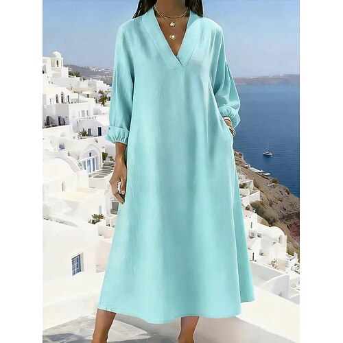 Per donna Abito Midi Finto cotone e lino Abito a Tubino Vestito Casual Abito in cotone Moda Moderno Quotidiano Weekend Vestibilità comoda Semplice Manica Lunga Scollo a V Blu Rosa Verde Cachi Estate