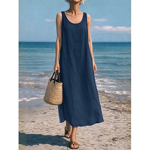 Per donna Abito maxi Finto cotone e lino Abito a Tubino Abito Estivo Abito Sottoveste Casual Spiaggia Quotidiano Vestibilità comoda Semplice Senza Maniche Collo a U Blu blu navy Giallo Rosso Estate