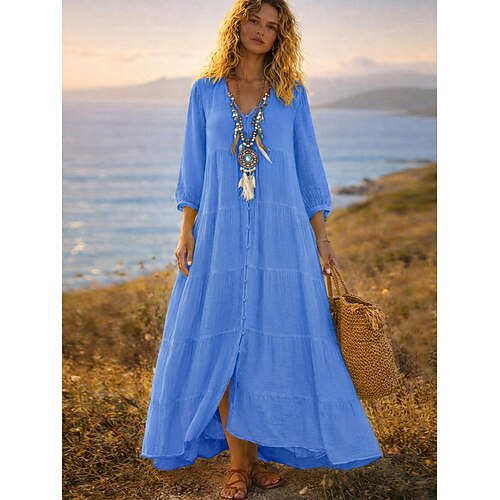 Per donna Abito lungo maxi Abito maxi Finto cotone e lino Abito Camicia Vestito Estivo Vestito a caftano Vacanza Essenziale Moderno Quotidiano Weekend Vestibilità comoda Semplice Manica 3/4 Scollo a V