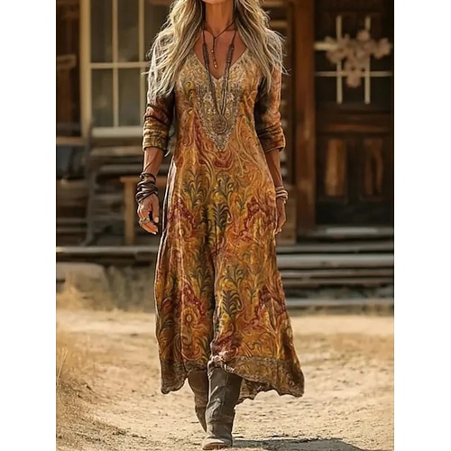 Per donna Abito maxi Abito a trapezio Vacanza Casual Boho All'aperto Uscire Vestibilità comoda Floreale Paisley Etnico Manica Lunga Scollo a V Nero Estate Primavera Autunno