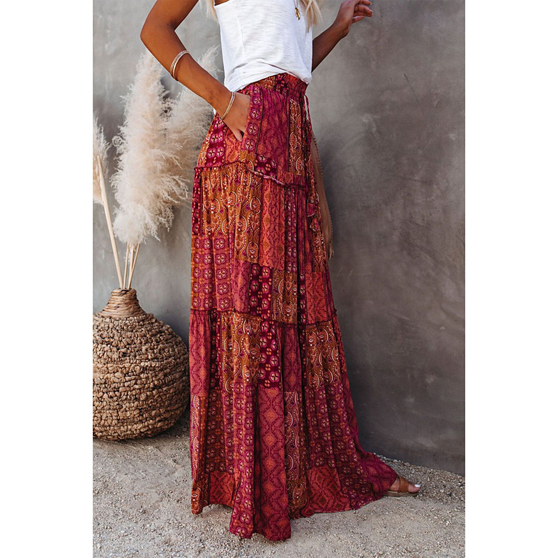 Women's Skirt Swing Long Skirt Bohemia Maxi Skirts Drawstring Print Graphic Solid Colored Causal Vacation Spring Summer Vintage Boho Red Blue Purple