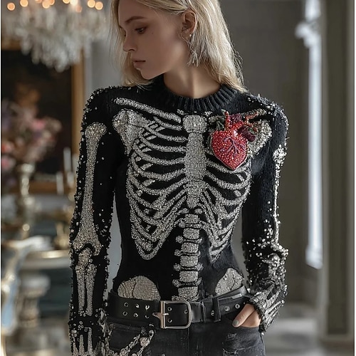 Maglione da donna Carino Streetwear Casual Grafica Scheletro Collo Giro Patchwork Lavorato a Maglia Manica Lunga Top Regolari Maglia Nera Rossa Autunno Inverno