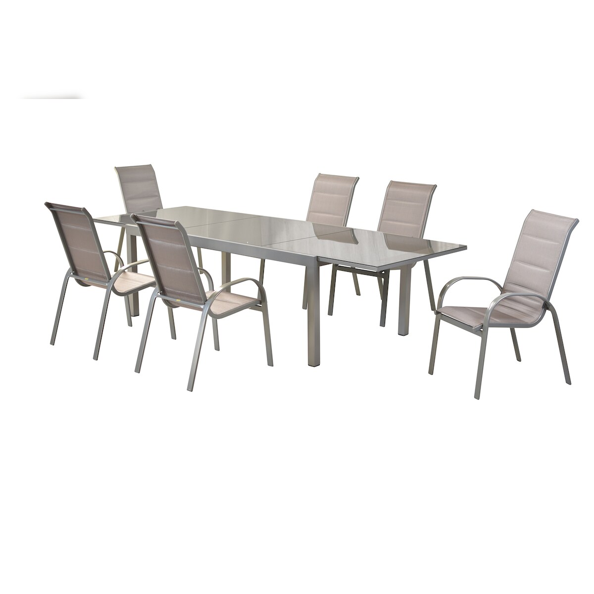 Merxx Amalfi di Lusso Set 7tlg., 6 Stapelsessel, Semi-Ausziehtisch 200 (300) x 100 cm, silber/diamantbraun, Aluminium/Textil