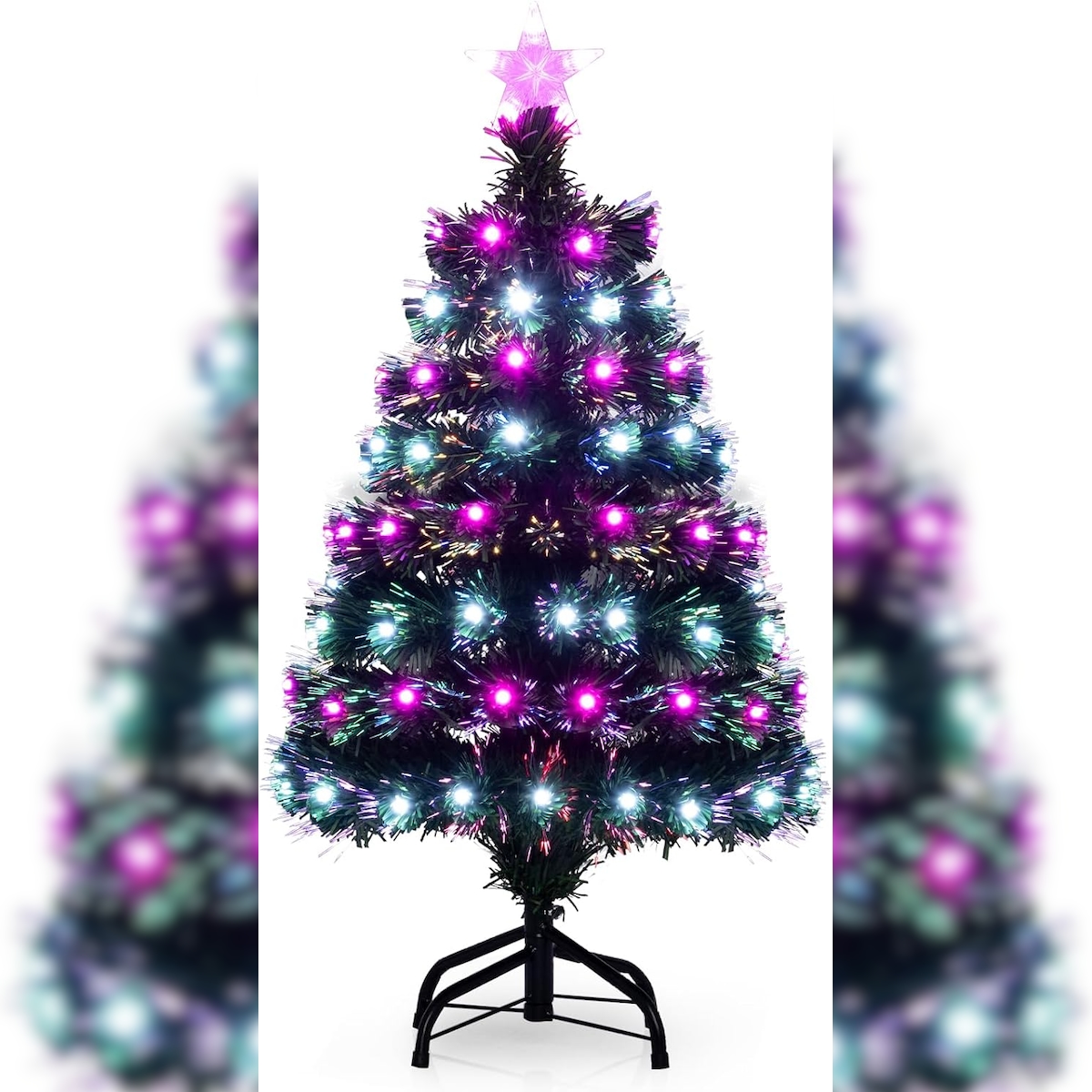 COSTWAY 90 cm künstlicher Weihnachtsbaum mit Beleuchtung, Tanne mit mehrfarbiger Glasfaserverzierung, 96 violette und weiße LEDs