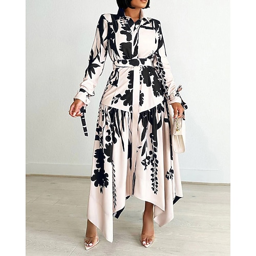 Per donna Abito Midi Abito Camicia Abito Floreale Abito Stampato Moderno Quotidiano All'aperto Uscire Vestibilità regolare Floreale Manica Lunga Colletto a Camicia Nero Vino Verde Blu scuro Primavera