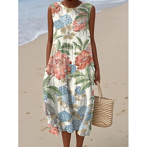Per donna Abito Midi Vestito Estivo Abito a Tubino Abito a trapezio Vacanza Casual Boho Uscire Spiaggia Vestibilità comoda Floreale Grafico Senza Maniche Girocollo Rosa Viola Verde Bianco sporco
