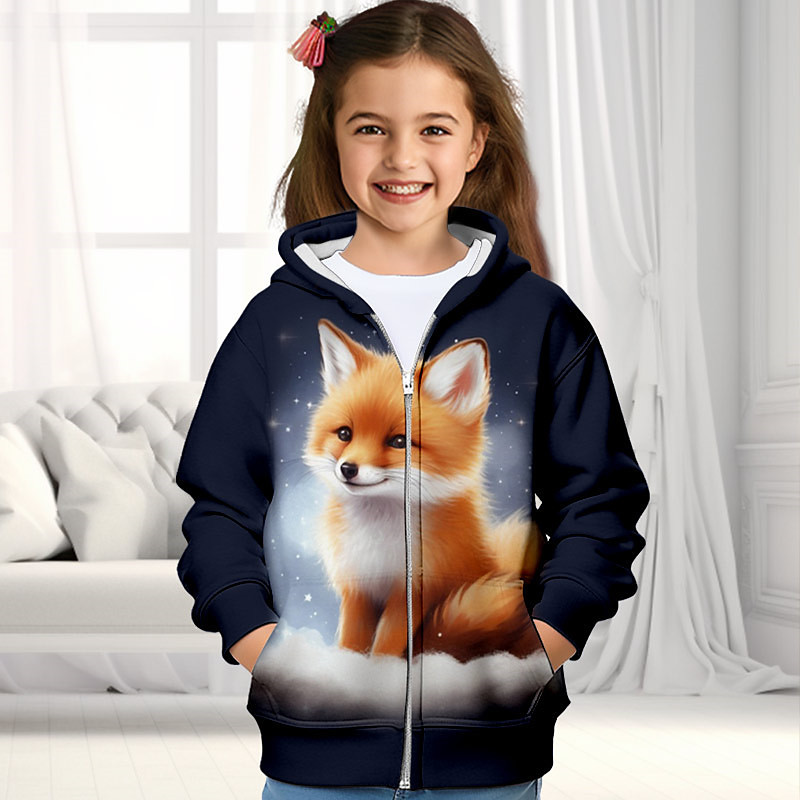 Girls' 3D Fox Hoodie Coat Outerwear Long Sleeve Fall Winter Active Cute Streetwear Polyester Kids 3-12 Years Zip Street Daily Regular Fit