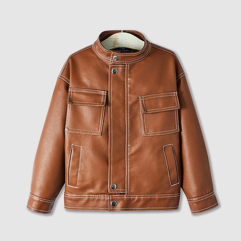 Kid's Boys' Black Leather Jacket Jacket Outerwear Plain Long Sleeve Zip Up Waterproof Windproof Coat Daily Fashion Casual Black Brown Spring Fall 4-12 Years