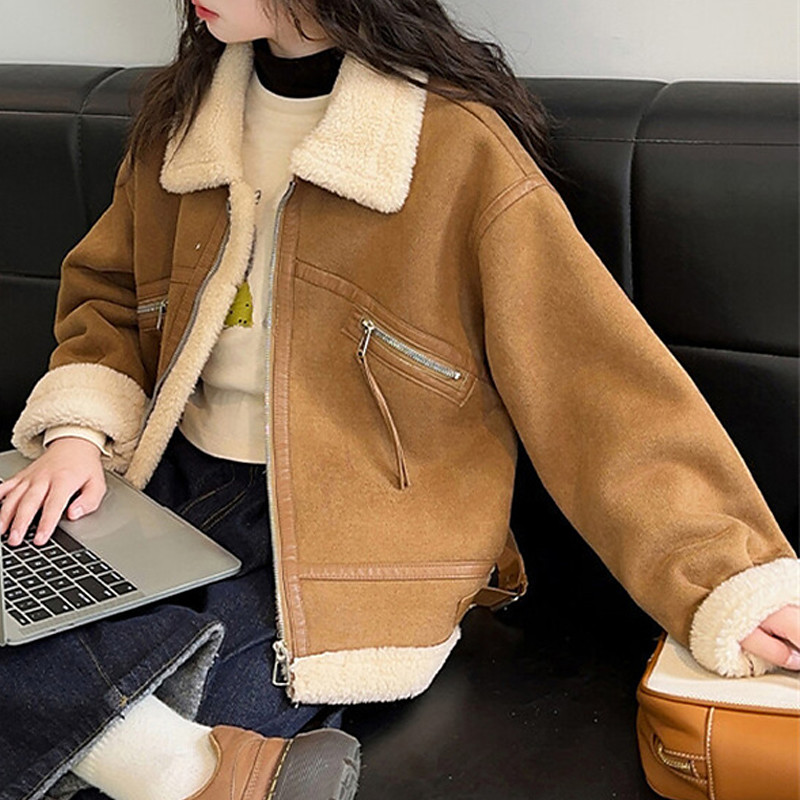 Kids Girls' Faux Suede Jacket Fleece Jacket Jacket Solid Color Fashion Zipper Pocket Outdoor Coat Outerwear 4-12 Years Fall Yellow