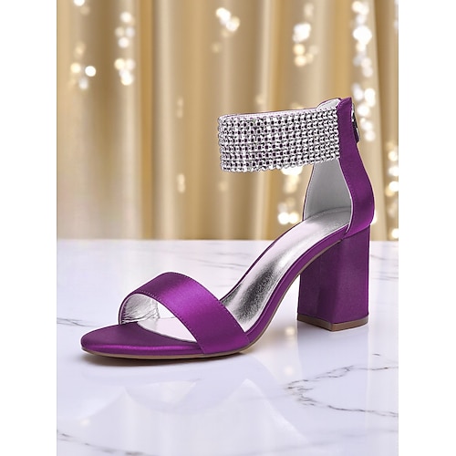 sandali da donna con tacco a blocco in raso viola, eleganti scarpe da sera con punta aperta e cinturino alla caviglia con strass, perfette per matrimoni, balli di fine anno eventi formali di festa