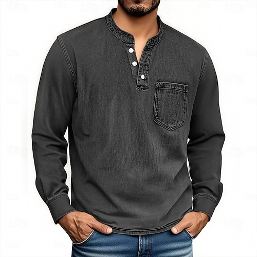 Maglietta vintage Henley da uomo, 100% cotone, lavaggio acido, manica lunga, Henley, autunno inverno, stile retrò, stile nostalgico, maglietta nera, rosa, blu navy, da uomo