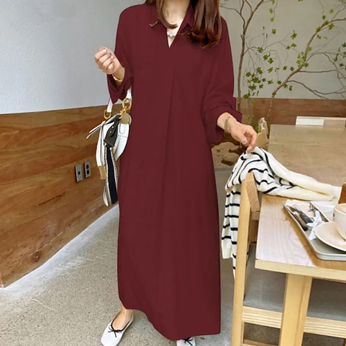 Per donna Abito lungo Abito lungo Abito chemisier Abito in cotone e lino Abito estivo Moda Informale Da mare Giornaliero Appuntamento Standard Liscio Manica lunga Bavero Nero Vino Cachi Verde militare