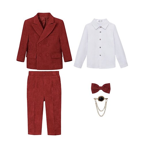 Completo da fedi per bambini, 5 pezzi, blazer pantaloni camicie cravatta ragazzo abito formale casual esterno festa moda fresco basic tinta unita tasca bottoni nero vino viola poliestere