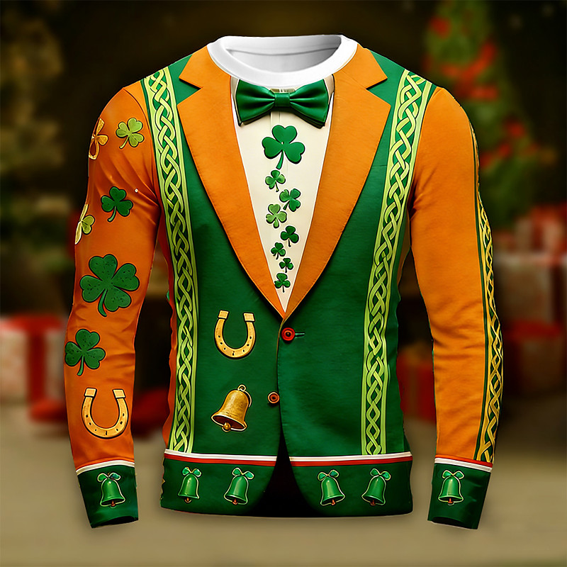 St. Patrick Men's Shamrock Lucky Irish Tuxedo T Shirt Long Sleeve T shirt 3D Print Crew Neck Shirt Designer Casual Club Party Holiday Red Orange Summer Spring Clothing Apparel S M L XL XXL XXXL