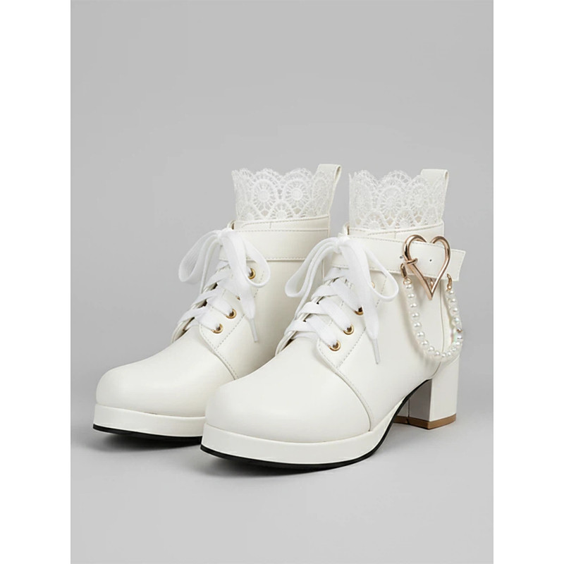 Women's White Bridal Ankle Boots – Lace-Up Wedding Shoes with Heart and Pearl Decoration, Chunky Heel for Vintage-Inspired Brides
