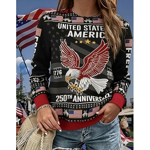 American 250th Women's Textured Pullover Sweatshirt Graphic Geometric Vintage Fashion Casual Long Sleeve Crew Neck Regular Tops Casual Home Work Black Spring Fall Winter