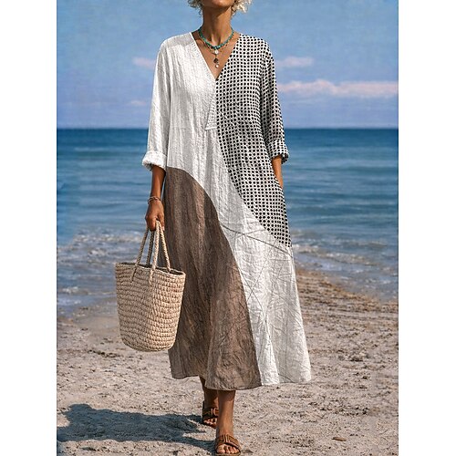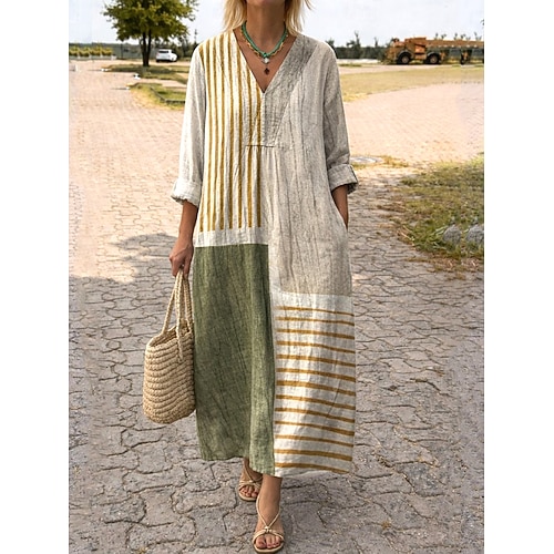 Damen-Maxikleid aus 100 % Baumwolle, Sommerkleid, Kaftan, weißes Kleid, Basic-Kleid, lässig, für Alltag und Freizeit, lockere Passform, einfarbig, halbe Ärmel, Rundhalsausschnitt, olivgrün, schwarz, weiß, weinrot, Sommer, Frühling, Herbst