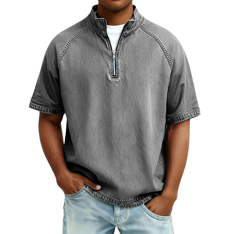 Men 100% Cotton Acid Wash Shirt Tee Top Short Sleeve Stand Collar Spring Fall Fall Winter Plain Vintage Streetwear Casual Zip Up Basic Casual Home Street Light Blue Black Brown Top Tee for Men