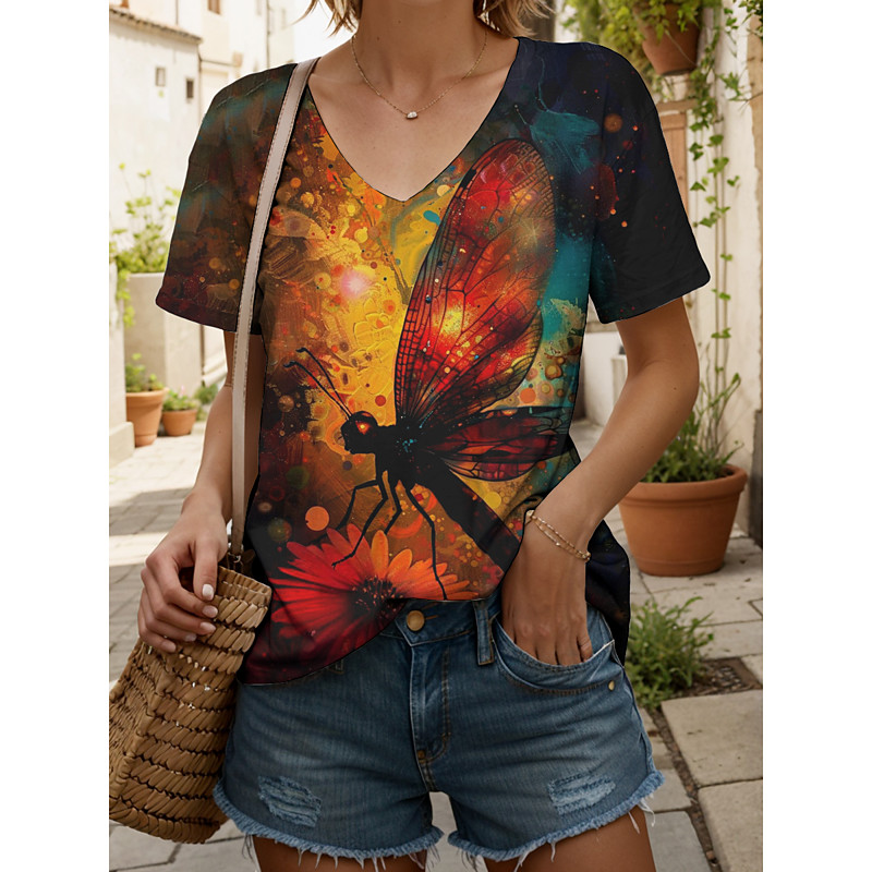 Women's T Shirt Graphic Animal Dragonfly Vintage Stylish Classic Short Sleeve V Neck Regular Tops Daily Going out Weekend Print Black Red Blue Purple Green Summer Spring