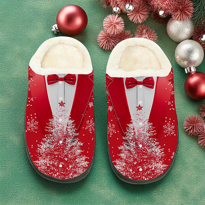Men's Christmas Suit Slippers - Festive Red Bow Tie Design Warm Fleece Indoor Shoes, Cozy Holiday Home Footwear for Winter and Christmas Gifts