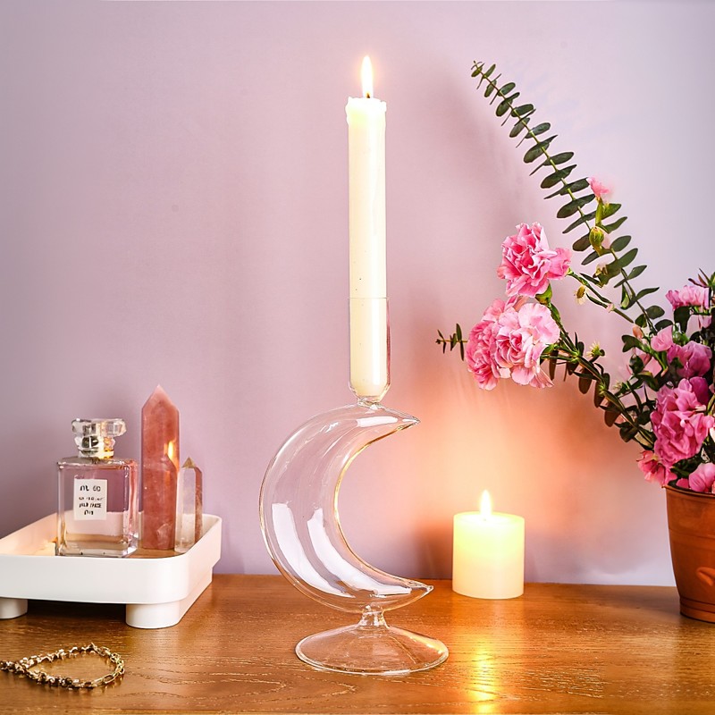 Ramadan Crescent Moon Glass Candle Holder – Transparent Glass Lantern for Iftar Dinner, Long Candles, Eid and Ramadan Decorations, Perfect for Muslim Home, Bar, Restaurant Decor and Gifts