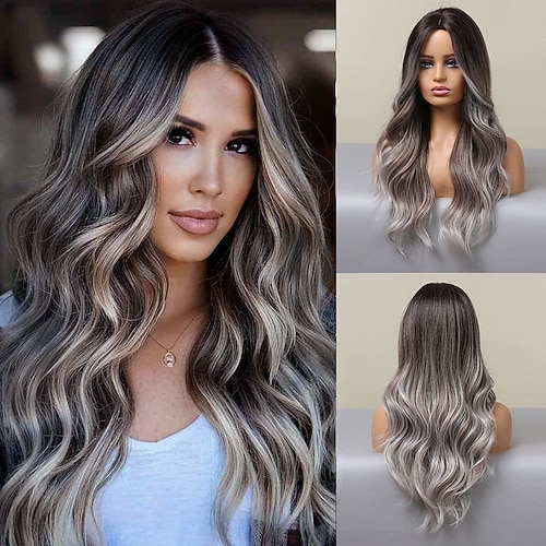 lunga parrucca ondulata marrone ombre per le donne parrucca da 26 pollici con parte centrale marrone chiaro parrucche in fibra sintetica resistente al calore dall'aspetto naturale parrucca riccia