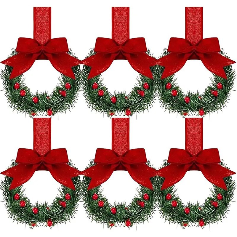 4/6PCS Mini Christmas Wreaths with Red Bows and Fruit Accents, Festive Holiday Window, Cabinet Home Decor, Perfect for Parties, Seasonal Decoration