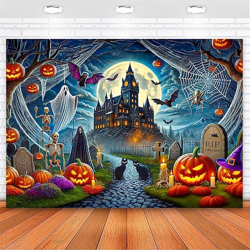 Arazzo di Halloween con castello infestato, sfondo da parete con zucca spettrale, fantasma, pipistrello, cimitero, grande tenda da appendere, decorazione murale horror gotico per camera da letto, soggiorno e casa