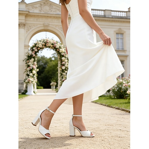 Weiße Brautjungfernschuhe mit Absatz – elegante Hochzeitssandalen mit offenem Zehenbereich, Blockabsatz und Knöchelriemen, perfekt für die Brautgesellschaft.