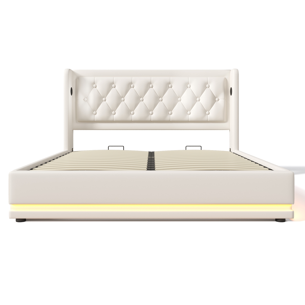 Merax Polsterbett Doppelbett 180*200 cm, Hydraulisches Stauraumbett, mit USB Typ-C Ladefunktion, LED-Funktion(Ohne Matratze), PU, Weiß