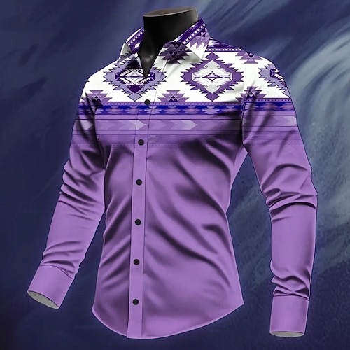 Per uomo Azteco Etnico Cultura indiana Camicia Camicia Western Camicia da cowboy Manica Lunga Vintage Retrò All'aperto Vacanza Primavera Autunno Collo ripiegato Stampa 3D Camicia tipo lino Viola