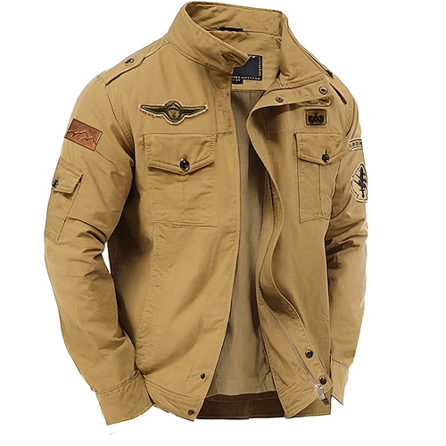 Herren Berg Cargo-Jacke Windbreaker Militärjacke Praktisch Lässig Outdoor Campen und Wandern Bestickt Seitentaschen Frontreißverschluss Herbst Winter Stehkragen Langarm Schwarz Kaki Armeegrün