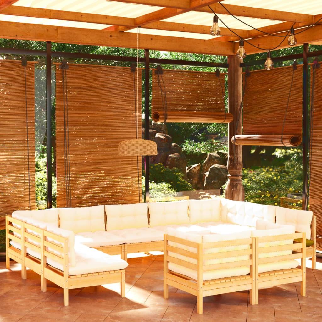 Loungesæt til haven 11 dele cremefarvede hynder fyrretræ