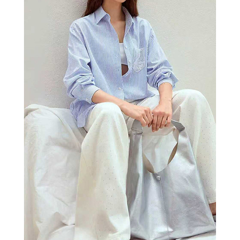 Women's Shirt Blouse Striped Casual Long Sleeve Shirt Collar Regular Tops Daily Holiday Pocket Buttons Blue Spring Fall
