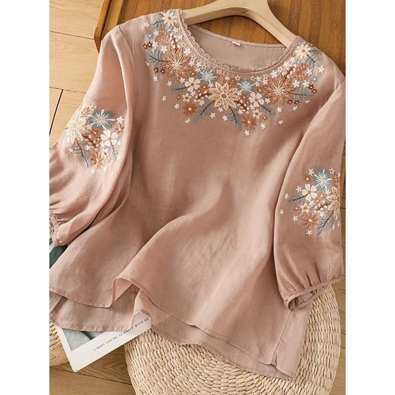 Women's Blouse Floral Stylish Casual 3/4 Length Sleeve Crew Neck Regular Tops Daily Embroidered White Pink Purple Summer Spring Fall