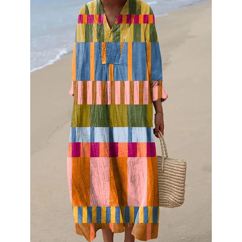 Women's Midi Dress V Neck Long Sleeve Kaftan Lightweight Loose Fit A Line Dress Casual Boho Party Loose Fit Graphic Geometric Long Sleeve V Neck Yellow Pink Blue Orange Fall
