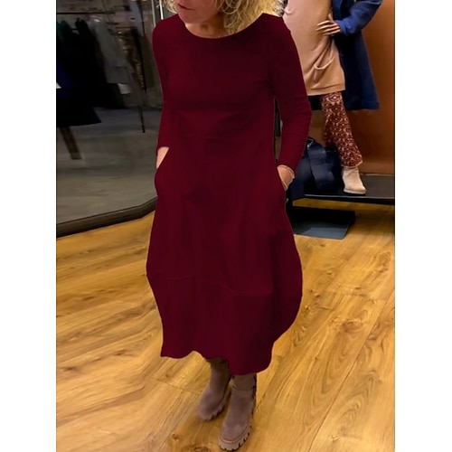 Per donna Abito Midi Vestito T-Shirt Casual Quotidiano Vestibilità regolare Semplice Manica Lunga Girocollo Nero Bianco Vino Marrone Primavera Autunno