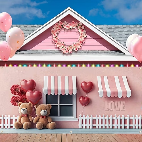 Copertura per porta da garage rosa per San Valentino, stampa piatta 2D di un simpatico orsetto con palloncini e rose, adorabile design amore, perfetto per vetrine o decorazioni natalizie,