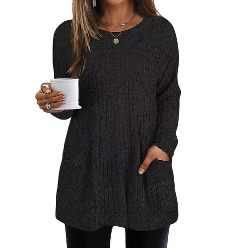 Damen Pullover Streetwear Lässig Einfarbig Rundhalsausschnitt Tasche Gestrickt Langarm Lange Oberteile Stricken Täglich Ferien Ausgehen Weinrot Schwarz Herbst Winter